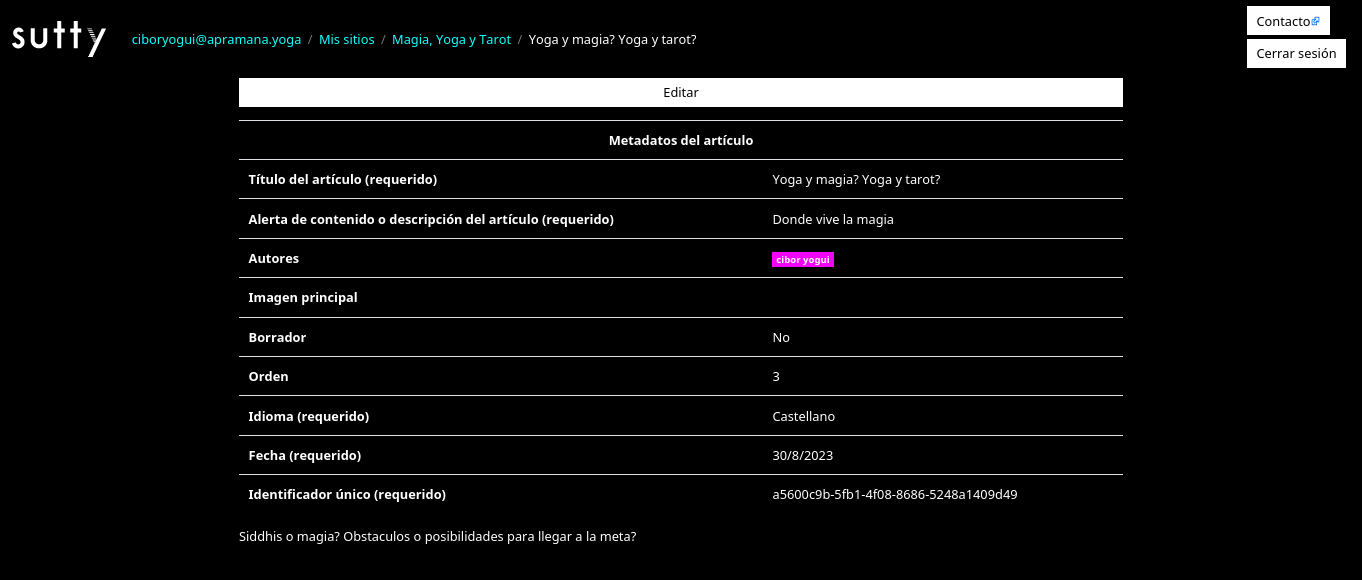 When you are ready, go to the bottom and press the Save button. You will be automatically redirected to the article view and its metadata (i.e. the data of your data). If you are not satisfied, you can press the Edit button and you will return to the screen to modify your article. Otherwise, you can return to the main panel of your site via the breadcrumbs at the top of the screen. Be sure to tap on the name of your site to return to that step.
