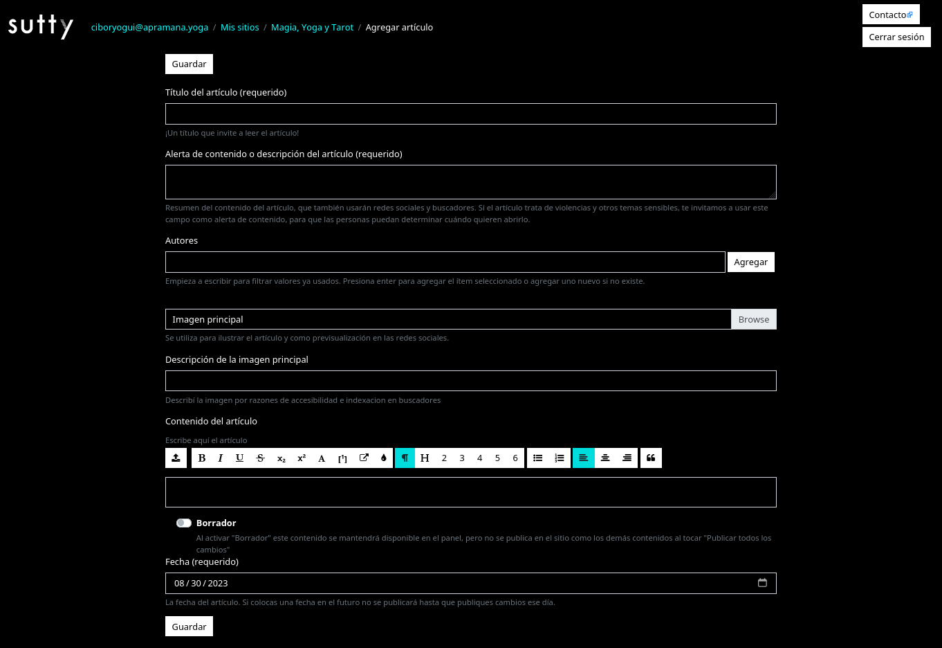 To enter the content of your article, you can use our text editor. There, you will have the option to highlight text as titles, subtitles, or third level headings, highlight with bold, use italics, add links and embed audio-visual content, among others. For this tutorial, we will enter a short text.
