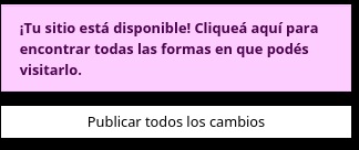 After pressing Save, you will be redirected to your site’s panel. A pink box with purple letters will now appear at the top, reminding you to publish the changes for the new configuration to take effect. On the left side you will find, again, the button to Publish all changes – click that.